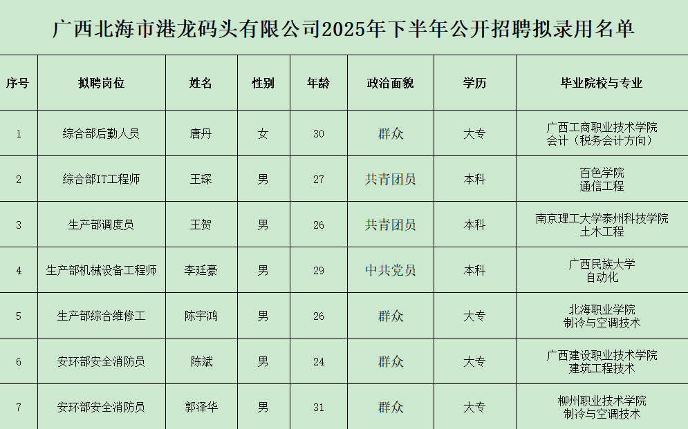 廣西北海市港龍碼頭有限公司 2025年下半年公開(kāi)招聘擬錄用名單公示